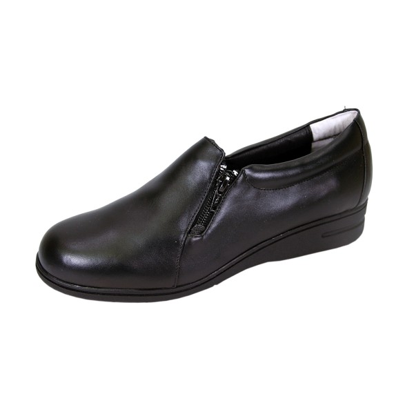 24 HOUR COMFORTÂ Bobbi women extra wide width step in shoes comes with a comfortable cushioned topline and back counter. A lightweight and durable comfort shoe with rubber outsole which provides maximum traction, and an action leather upper to enhance breathability which doesn’t bother your feet throughout a continuous working day.The side zipper closures creates a comfortable, secure fit and a classic style.