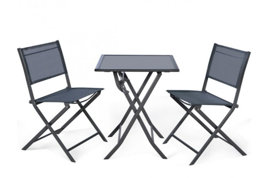 It is made of durable steel and fabric. It includes 1 glass top folding table and 2 foldable chairs. The chairs and table are very lightweight, you can tuck it away when you finish your dinning. The deft design will suit for your modern home decoration.