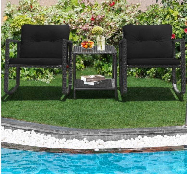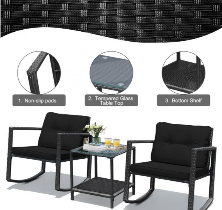 3 Pieces Cushioned Patio Rattan Set with Rocking Chair and Table In Black