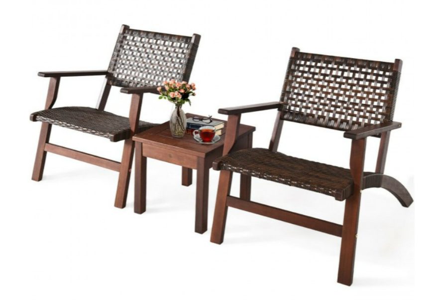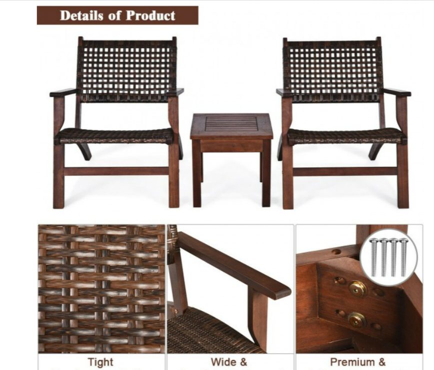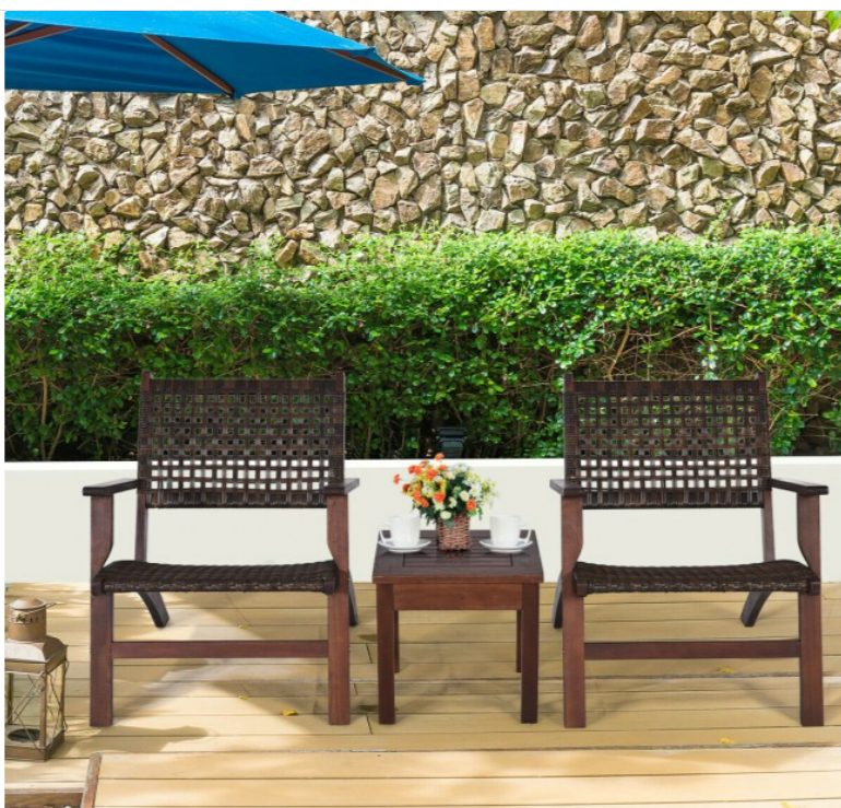 Made of sturdy eucalyptus wood and premium rattan, the bistro set is sturdy and durable which can be used for long time