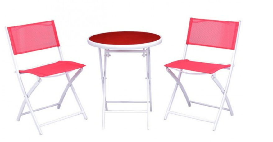 The set includes two folding chairs and one folding coffee table with black tempered glass. The seat and the backrest are made of textile fiber. The frame of the chairs and table are made out of metal tubes and it is exceptionally sturdy. It is enjoyable to have breakfast or afternoon tea in the garden or other outside space with this comfortable and attractive patio set which features a simple design.