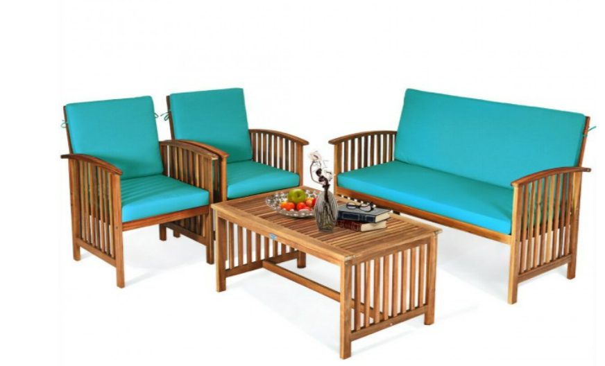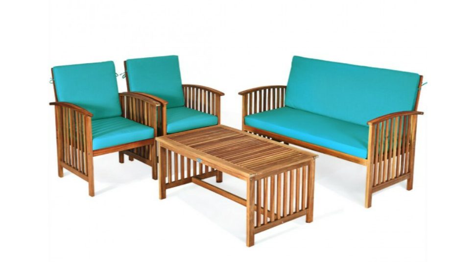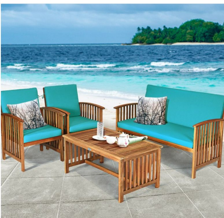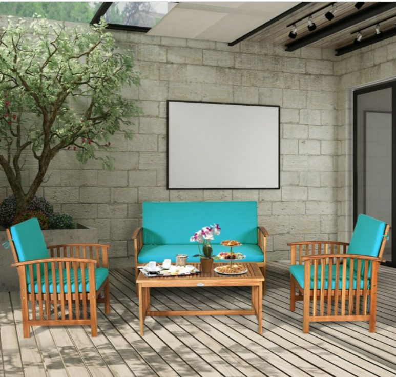 4 Pcs Patio Solid Wood Furniture Set with Water Resistant Cushions In Blue