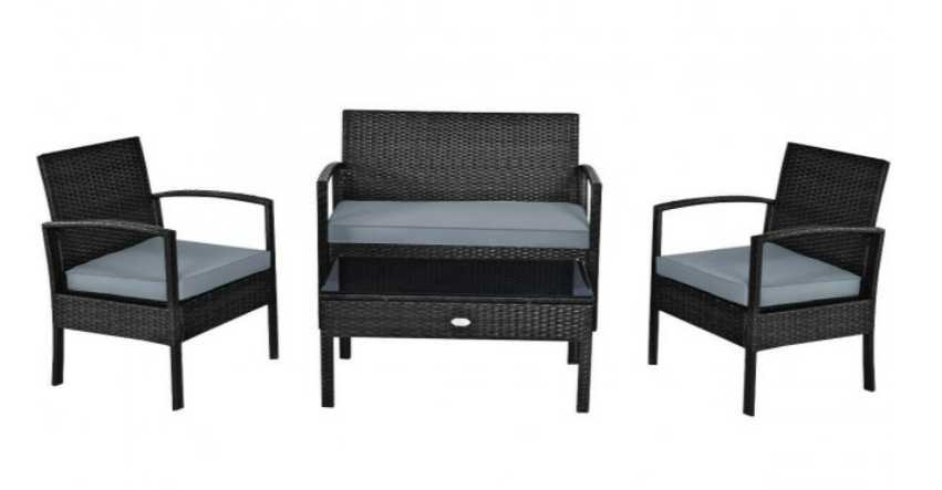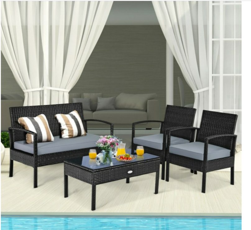 4 Pieces Patio Rattan Cushioned Furniture Set with Loveseat and Table In Black
