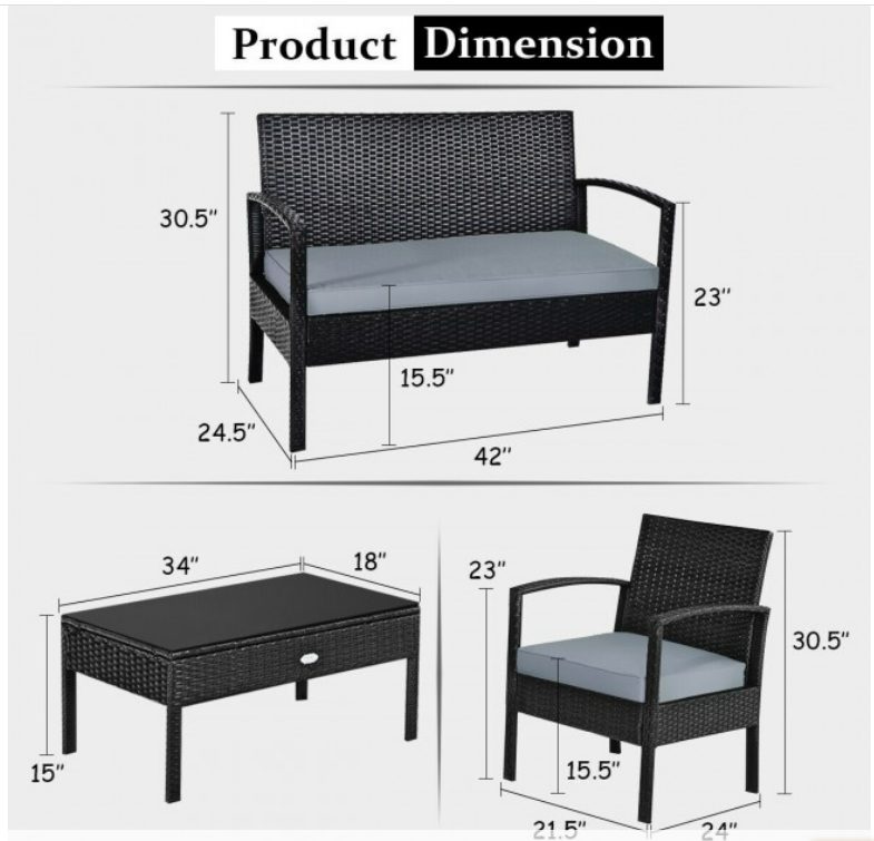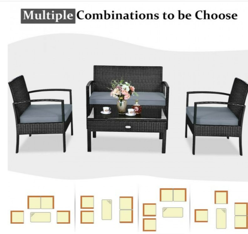 Breathable and soft cushions will hold you comfortably and the cover of cushion can be removed with smooth zipper. Featuring with 1 coffee table, 1 loveseat and 2 single chairs, this patio furniture set can be combined in various ways according to your different needs. Moreover, the simple and stylish design enables you to put this sofa set in any place you want.
