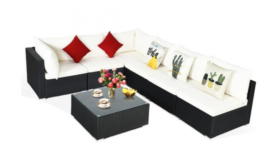 This premium 7-piece patio furniture set comes with 4 armless sofas, 2 corner sofas and a coffee table.