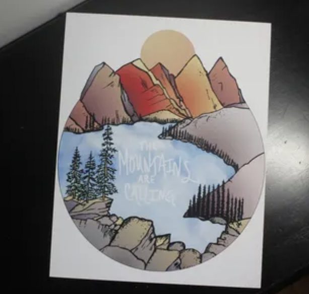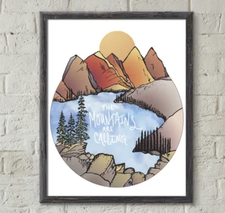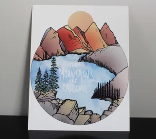 The Mountains are Calling signed illustrated print by Jill Hunt. Lettering by Alexa Hunt.