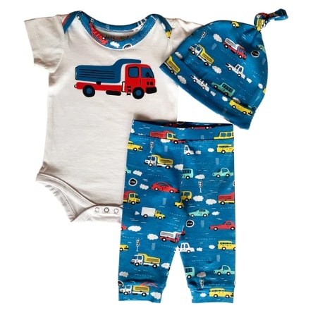 This 3-piece Automobile Layette Gift Set features a one-piece bodysuit with diaper button fastenings for easy diaper changing and a matching pair of joggers/pants with Head Cap.