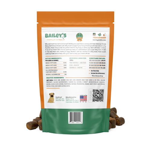 Each soft chew contains 3mg of our finest CBD-rich full spectrum hemp oil, contributing to your pup’s daily dose of CBD to help keep them calm, healthy & happy.