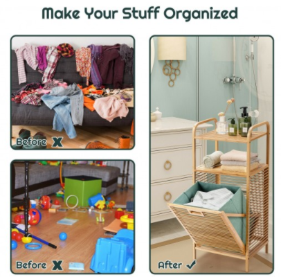 - Space-Saving Design: Single load tilt-out bamboo hamper stand with 2-tier shelves and 1 fold-out polyester cloth hamper, easily access your laundry via the tilt-out slatted front, provide ample storage space.