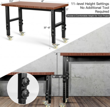 - Multi-level Height Adjustment: This workbench has 11-level adjustable heights from 30″ to 40″. This function can help the workbench height to match different chairs and satisfy your different work demands. The only thing you need to do is rotating the knob until you find the most comfortable height.