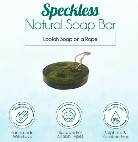 -NATURAL INGREDIENTS. Healthy-looking skin requires the best products in your daily routine. Speckless Soap Bar is the best way to cleanse and soothe your body. Enriched with natural ingredients like chia, lemon, parsley, and coconut oil. This Soap Bar cleanses, clarifies, and moisturizes naturally. The soap includes a natural loofah and a hanging cord. The natural loofah helps gently exfoliate.