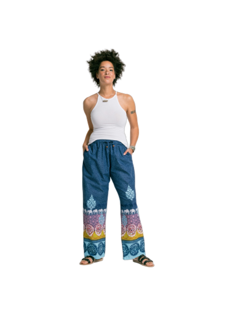 The Bhara print features marching elephants, spinning mandalas and swirling henna bedecked like a magical Indian dream collage of blues, pinks, and accents of lemongrass and paprika.