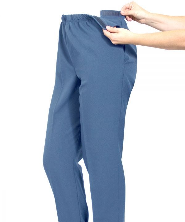 These Side Opening Adaptive Arthritis Pants feature an easy access hook and loop fastener on each side to make arthritic dressing a breeze! These easy to put-on pants/trousers feature adjustable easy touch strips on both sides of the waistband allowing for adjustable, struggle-free dressing. The front fold-down panel provides slip-on ease from a wheelchair or seated position.