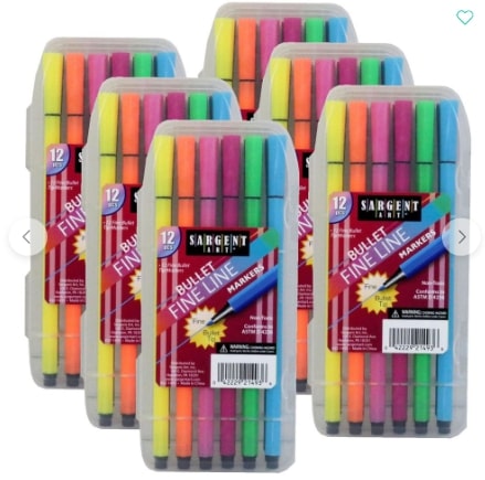 Perfect for drawing, coloring, crafts, and coloring books and pages. Non-toxic and safe. Each pack includes 12 different colors with fine, bullet-shaped tips in a plastic case.