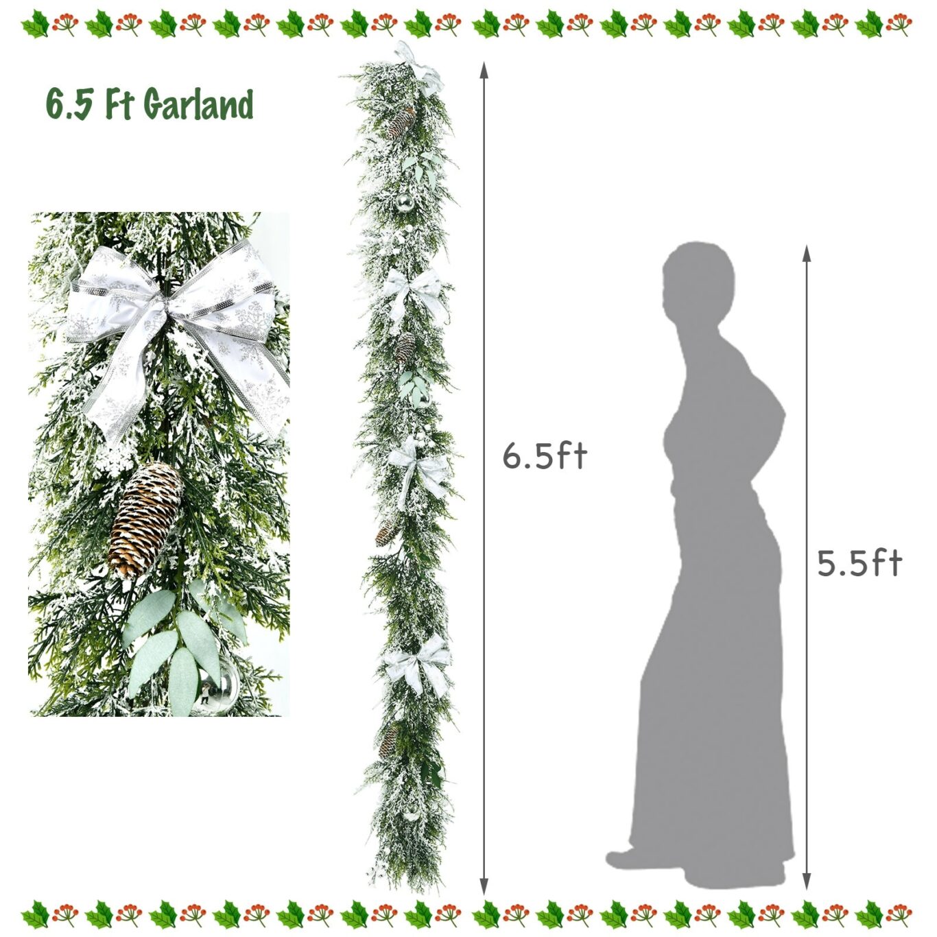 This is 6.5 feet un-lit flocked Christmas garland, which is trimmed with gloss silver balls, snowflakes, ribbons, leaves and white berries. The lush and lifelike rattan has 280 PE cypress branch tips, which looks as real as real plants. You can hang the rattan up by the hook in the end to decorate your home. Add garland on your front door, fireplace stand, stair railings, window frame and dinning table to enjoy a warm and exciting Christmas! And the garland is made of 100% new PE, which is odorless, non-toxic and durable for long time use. It can definitely stay with you for a long time.