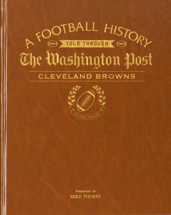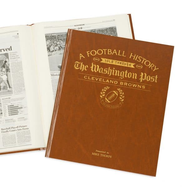 Capture the history and greatest moments of the Cleveland Browns through Washington Post newspaper articles written at the time. Each page is made of articles covering memorable games and events in the Browns’ history, beginning in December 1946 with Cleveland’s 14-9 All-America victory over the New York Yankees, then moving on to cover their success into the mid-1960s. More recently, there is coverage of the 2002 Playoffs, along with numerous big-game wins since including their 2012 tide changing win over the Steelers. This book is a unique and wonderful gift and a must have for every Browns fan. Reproduced to near full tabloid newspaper size it is bound in luxury tan leatherette, gold embossed hardback cover. Further personalization can include a message from you on the title page.