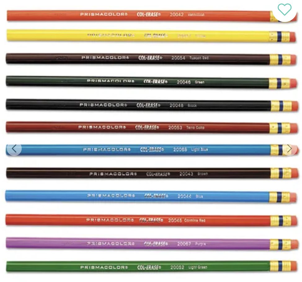 Prismacolor Col-Erase Pencils with Erasers feature vivid, easily-erasable pigments and a strong point that resists breakage.
