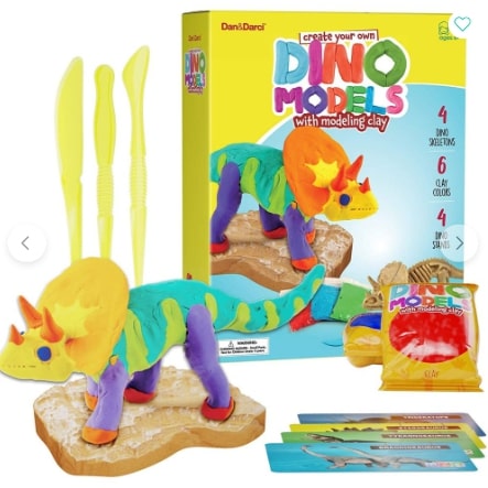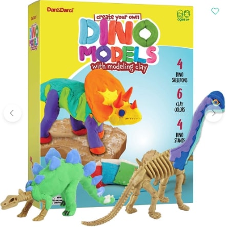 - Â KIT INCLUDES: 4 dinosaur skeletons (T-rex, Brachiosaurus, Triceratops, and Stegosaurus), 6 colors of modeling clay, 3 sculpting tools, 4 dino stands, 4 dino learning cards, and an instruction guide.