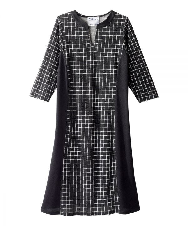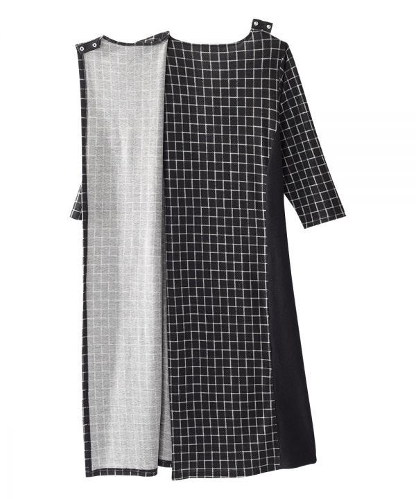 Women’s Stylish Color Block Sweater Knit Open Back Adaptive dress that allows easy access for dressing & designed for wheelchair-friendly comfort. Terrific for lowered upper arm mobility. It also features a generous back overlap with snap closure at each shoulder that provides complete comfort and discretion. This dress also features flattering contrast side panels and a delicately notched collar for a stylish and cozy flare. Well designed for fashion lovers and their caregivers. This adaptive dress is terrific for elderly/seniors who are disabled or wheelchair dependent. A great product for home care, retirement, and nursing home settings.