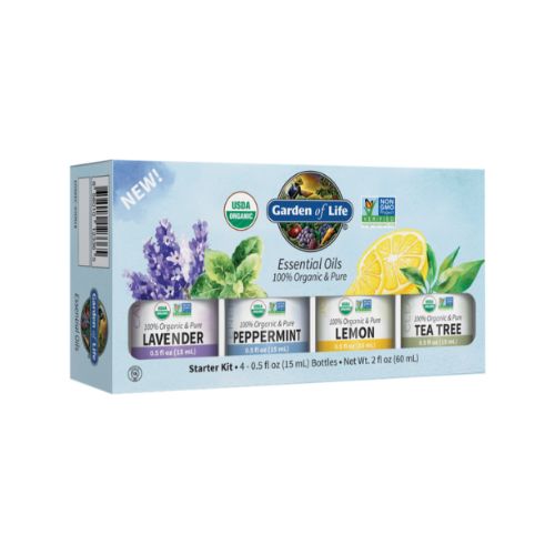 The Garden of Life Organic Essential Oils Starter Kit combines four of our most popular fragrances: Lavender (calming & floral), Lemon (clean & citrusy), Peppermint (minty & fresh), and Tea Tree (herbaceous & leathery).