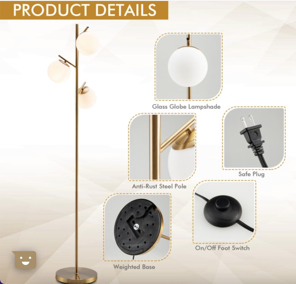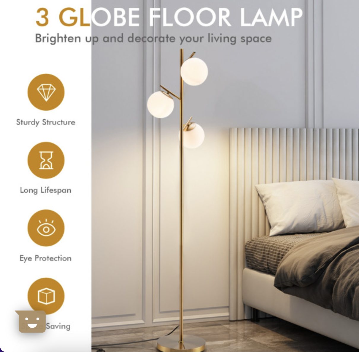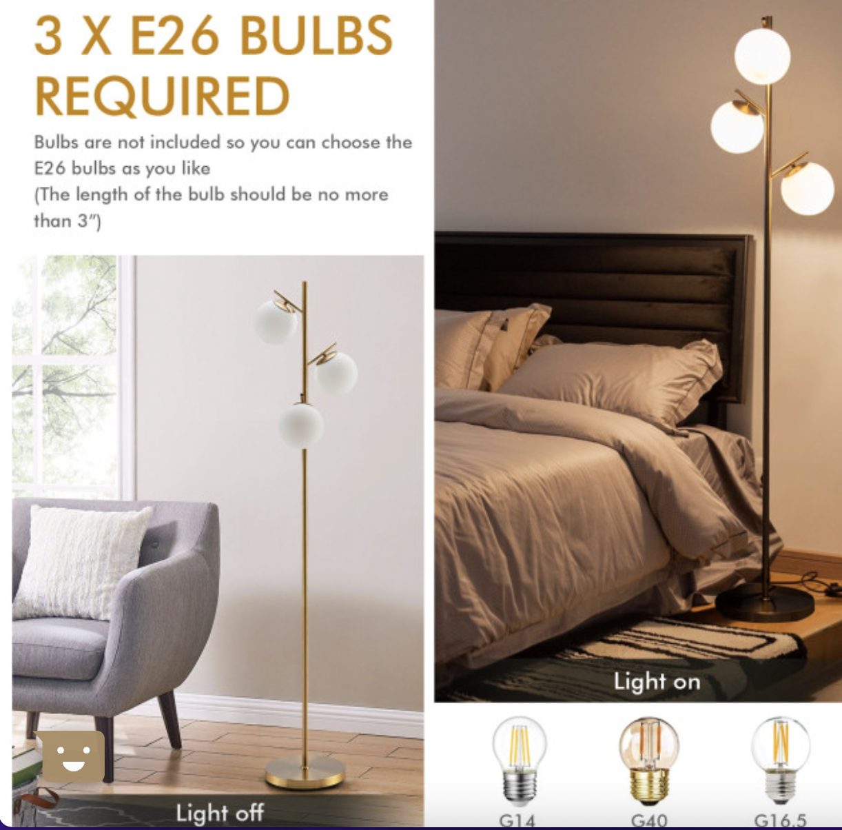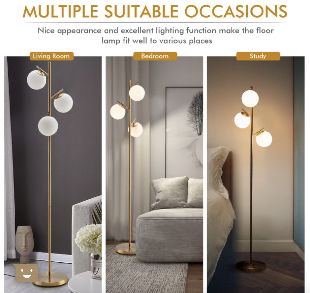 The floor lamp features a thick and weighted base to ensure the stability. And the anti-rust steel pole firmly supports the three globes. Furthermore, the golden metal appearance makes this floor lamp a perfect match for rooms of modern style. And the premium glass lampshade not only brings warm light but also adds a piece of elegance to your room. Do not worry about it taking up too much space. Its compact and slim size allows you to place it in the corner of the room.