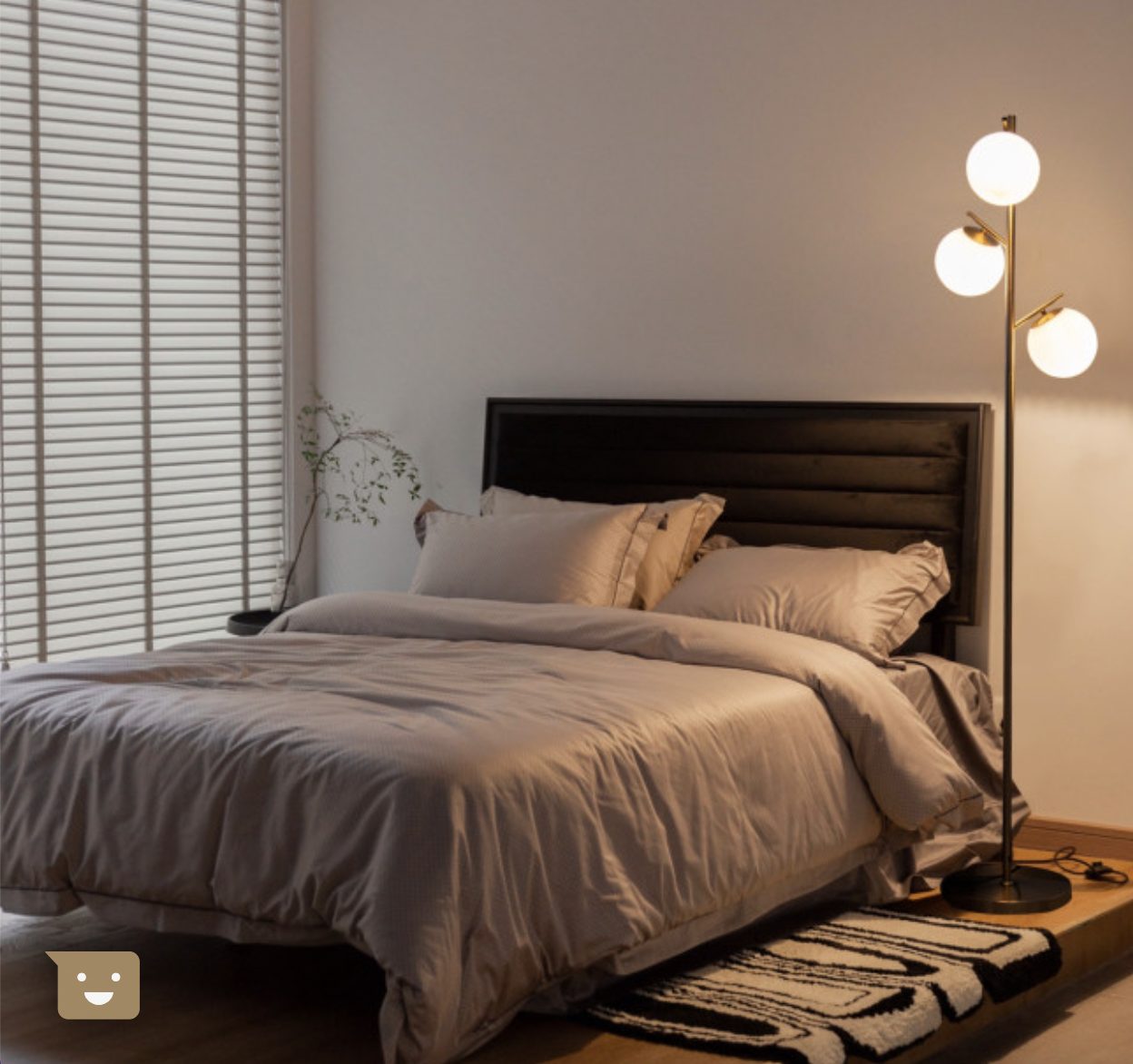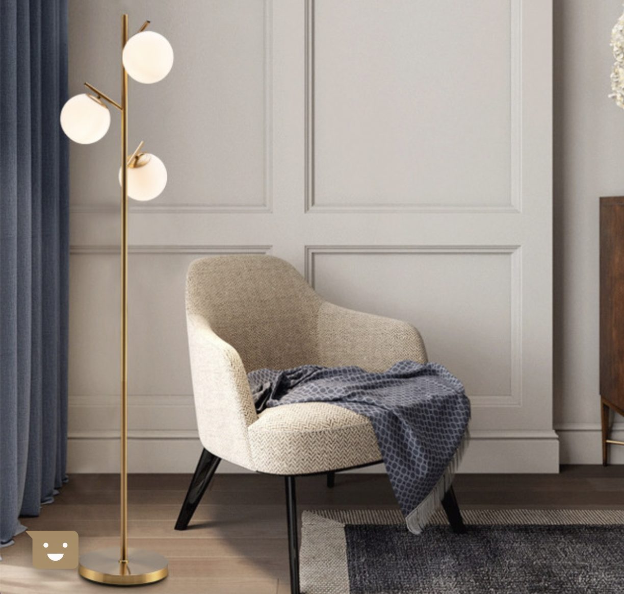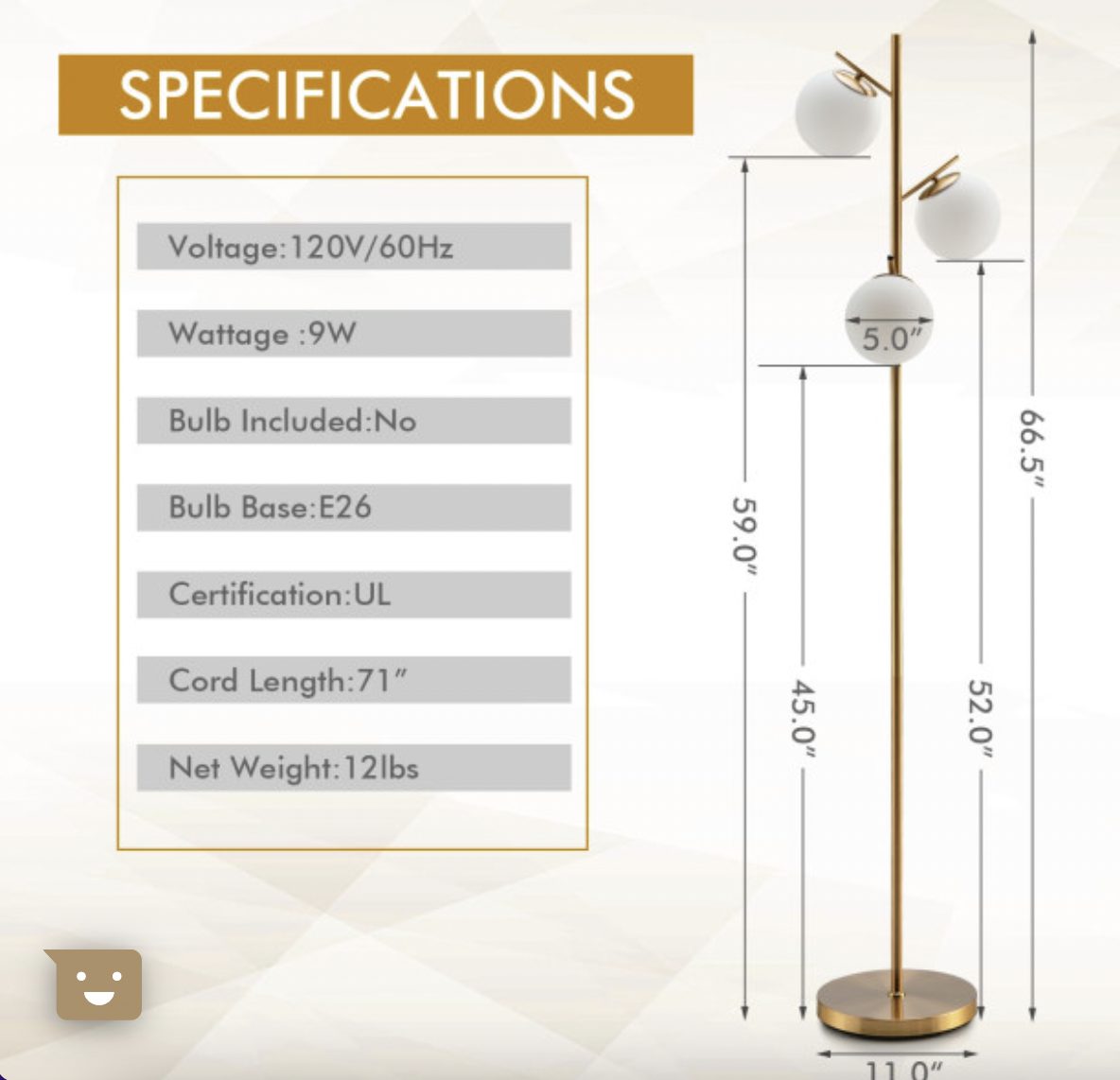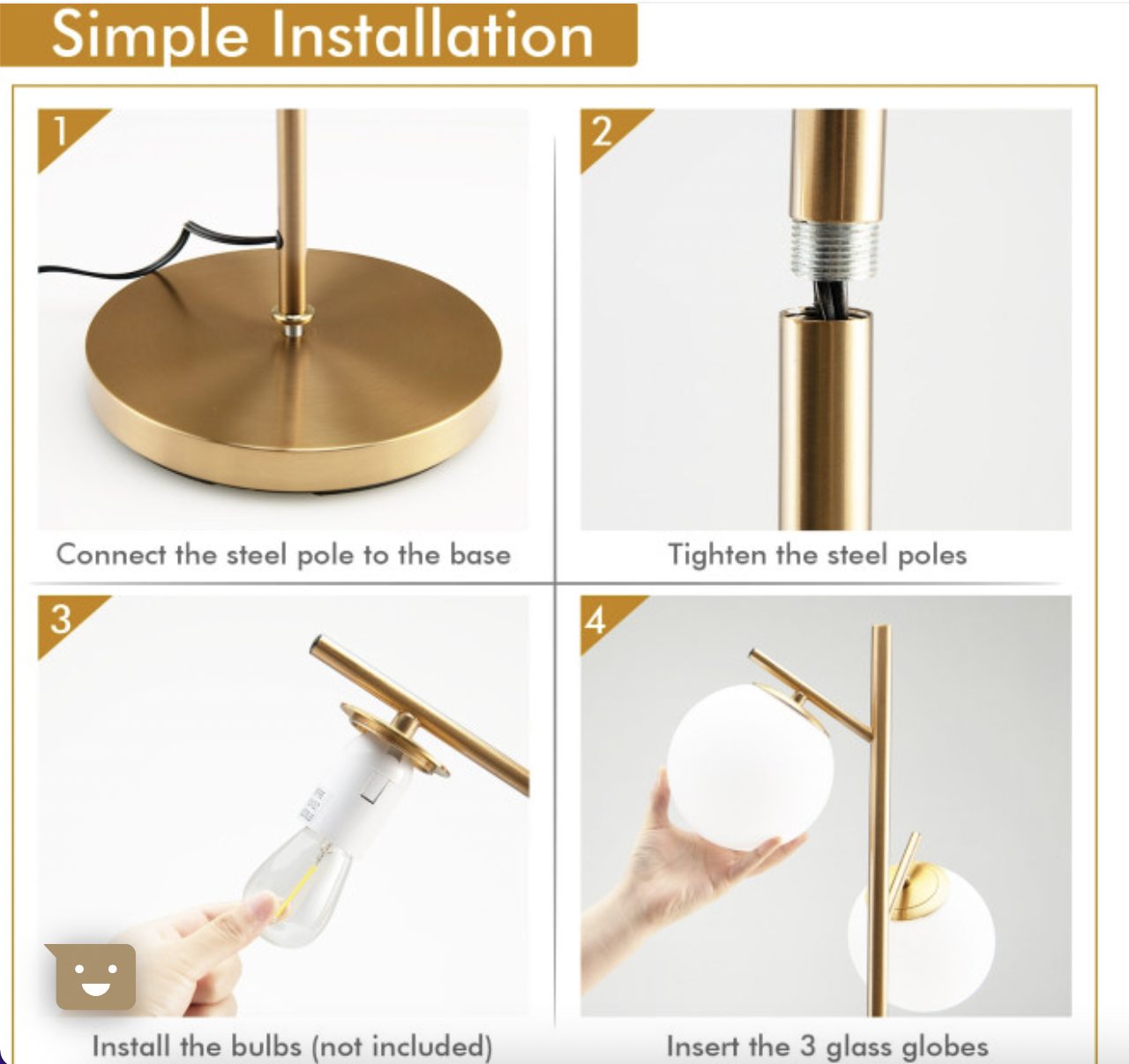 The floor lamp features a thick and weighted base to ensure the stability. And the anti-rust steel pole firmly supports the three globes. Furthermore, the golden metal appearance makes this floor lamp a perfect match for rooms of modern style. And the premium glass lampshade not only brings warm light but also adds a piece of elegance to your room. Do not worry about it taking up too much space. Its compact and slim size allows you to place it in the corner of the room.