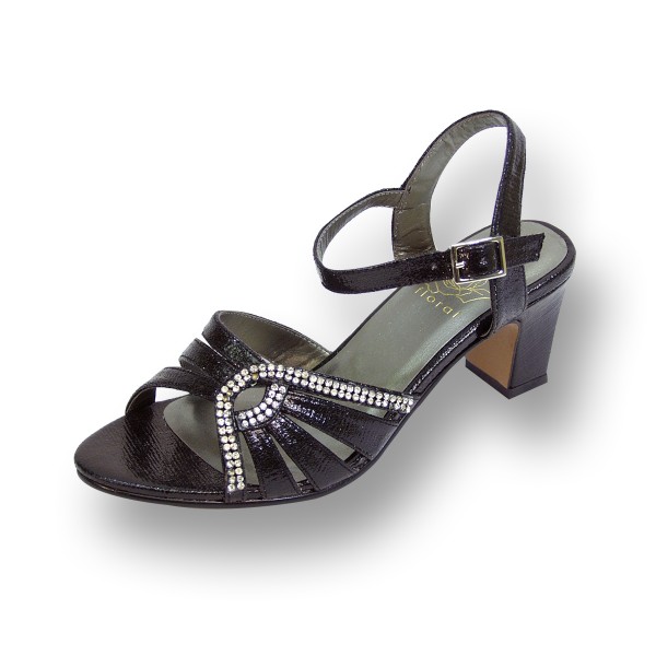 FLORALÂ Carla women’s extra wide width dress sandals are the perfect addition to your wardrobe. This ladies 2.5″ mid heel adjustable buckle strap with rhinestone strips on an open toe front and metallic upper will sure to become your go-to shoe for all of your special events.