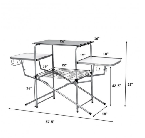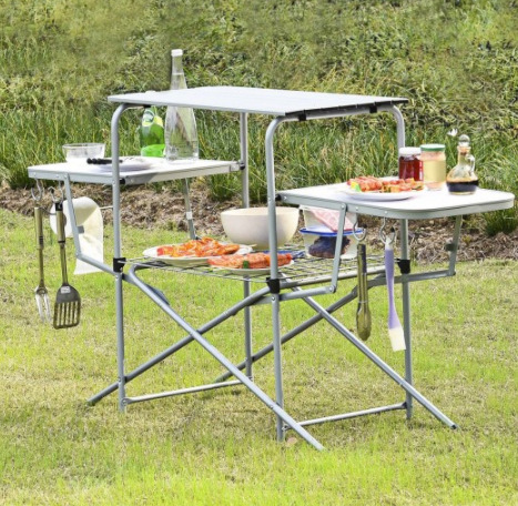 This is the foldable grilling table that can experience all the comforts of home. Equipped with sturdy steel, heat-resistant aluminum, and moisture-resistant MDF, it features heavy-duty, durability, stability so that can serve you for a long time. This outdoor kitchen stand also features a large top surface area, two side tables, and a lower shelf ideal for storing supplies and condiments. It includes attached hooks for hanging grilling tools and a paper towel rack. The lightweight and one-piece design make you hold easily and provide you a lot of storage room. Easy set-up and folds down in less than a minute allow you to enjoy the camping trip as soon as possible.