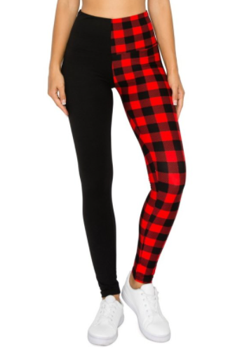 SALE Leggings Full Length Splice Red & Black Plaid Print High Waistband