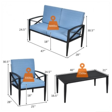 The patio sofa set is made up of 1 side table, 2 single sofas, and 1 loveseat with ample resting room. Each seat is cushioned with a high-density sponge covering with breathable and soft fabric.