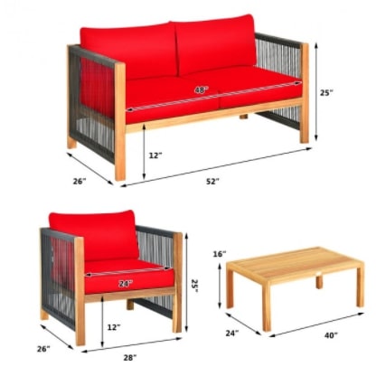 Made of premium acacia wood, the set’s frame is sturdy and resilient to crack and deformation. All available single chairs and loveseat come with a soft and high-resilient cushion on the seat and backrest. Excellent comfort is guaranteed upon using the sofa. With the hidden zipper, the covers are easily removable for laundry or cleaning purposes. Additionally, each unit of this set can be rearranged to a configuration of your preference.