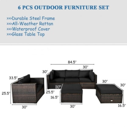 This 6 PCS rattan sofa set includes 2 corner sofas, 1 armless sofa, 1 single sofa, and 2 ottoman sofas. Powder-coated steel and premium PE wicker provide sturdiness and durability to this patio furniture set.