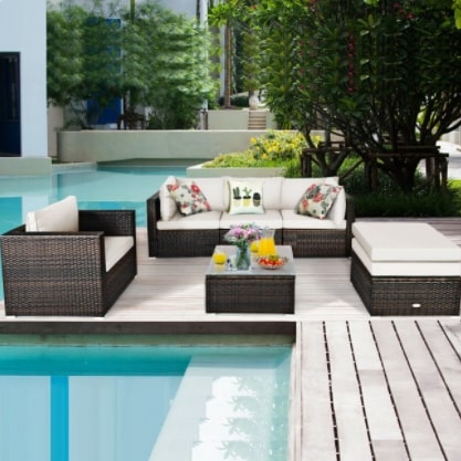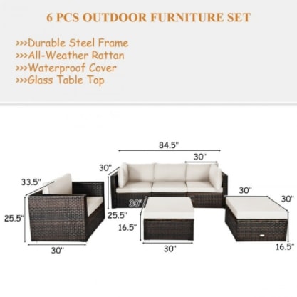 This 6 PCS rattan sofa set includes 2 corner sofas, 1 armless sofa, 1 single sofa, and 2 ottoman sofas. Powder-coated steel and premium PE wicker provide sturdiness and durability to this patio furniture set.