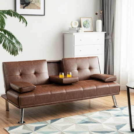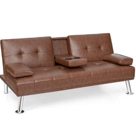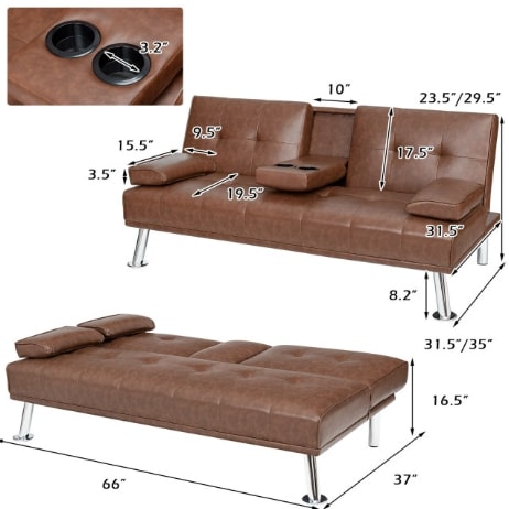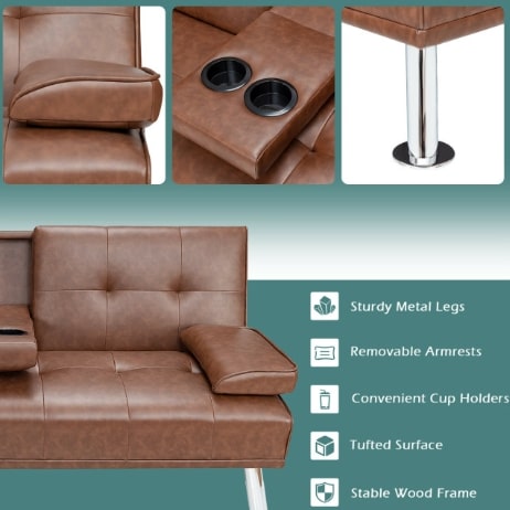 Futon Sofa Bed Leather Cushion & Cup Holders In Brown