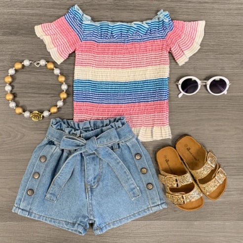 Girls Outfit Striped Smocked Denim Short Set