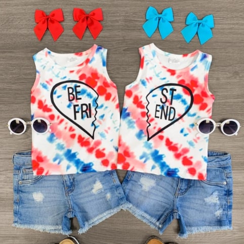 These “Best Friends” Tie Dye Red White & Blue Tops feature tank sleeves, and a BFF saying embossed on the front.