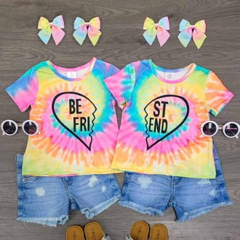 Girls Top BBF Tie-Dye Best Friend Heart Short Sleeve Left Side