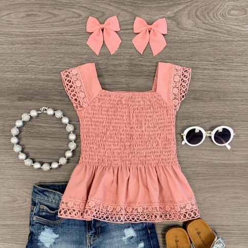 Your little one will love the comfort and cool style this Lace Peplum Top brings to her warm-weather wardrobe. Made from soft & breathable fabric, this girls’ smocked top feels cozy against the skin, while the eyelet lace details offer a fun touch for Spring.
