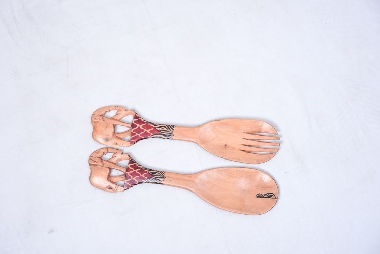 HANDCRAFTED AS ONE PIECE THE BEAUTIFUL SALAD SERVER FROM AFRICAN JACARANDA WOOD WITH A SINGLE ELEPHANT CARVED INTO THE TOP OF THE HANDLE AND THEN SMOOTH POLISHED WITH OLIVE OIL TO MANTAIN IN THE NATURAL COLOR OF THE AFRICAN WOOD. THE JACARANDA TREE IS ECO FRIENDLY . EACH SET IS HANDMADE SO VERY SLIGHT VARIATIONS MAY OCCUR AND HAS THE SPOON SPOTTED WITH A DESIGN AND THE FORK WITHOUT A SPOT