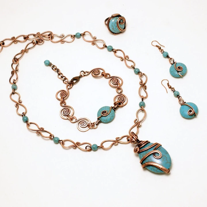 Wire wrapped jewelry set, copper jewelry set, turquoise jewelry set, december birthstone jewelry set, turquoise necklace earrings bracelet ring.
