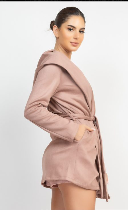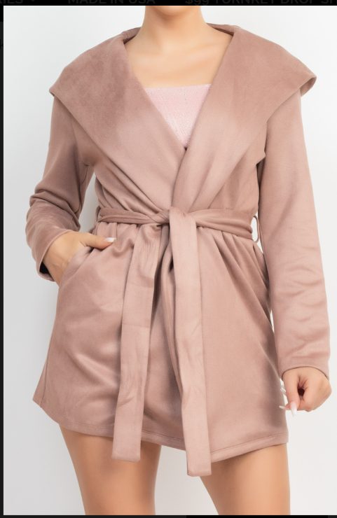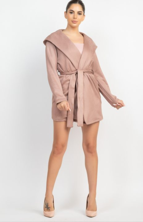 A suede outerwear jacket in solid color featuring a hood, waist-tie detachable belt sash, also can be worn open-front and long sleeves.