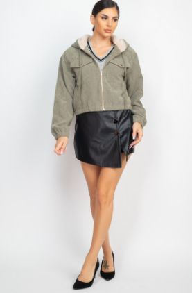 A ribbed hoodie jacket featuring a corduroy material, long sleeves, faux fur inner lining, front zip closures, and chest flap pockets with buttons accent.
