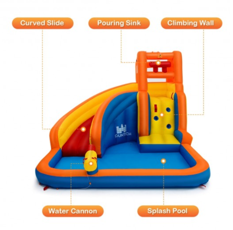 - Multi-Functional Water Fun: This outside inflatable water bouncer includes a curved long slide and a climbing wall that are both equipped with sprinkler heads, a wide splash pool with a water cannon as well. Besides, the top of the slide is surrounded by netting to protect your kids from sliding out.