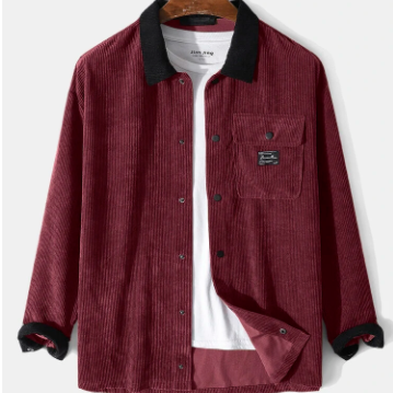 Men’s corduroy, snap button-down, jacket with contrast collar and shirt pocket. Great for cooler weather seasons with a moderate thickness and regular fit.