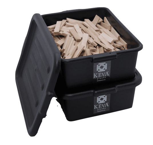 Set Includes: 800 maple KEVA planks, two durable plastic tubs with lids for easy stacking.