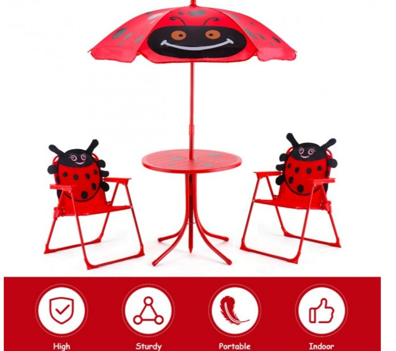 This high quality and brand new children’s furniture set includes one table, two foldable chairs, and an umbrella