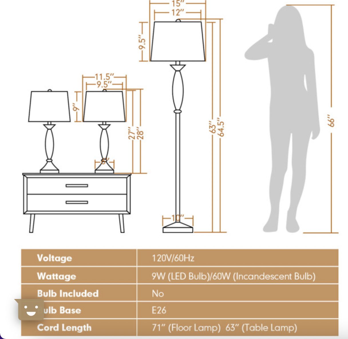 - Cord length: 71″ (Floor lamp) 63″ (Table lamp)