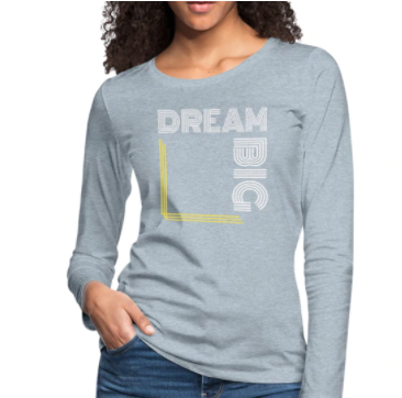Long Sleeve T-Shirt ” Dream Big White & Gold” In Heather Ice Blue