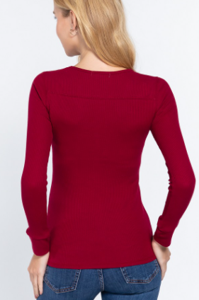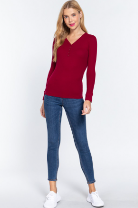 Long Sleeve Top Wine V-Neck Placket Thermal