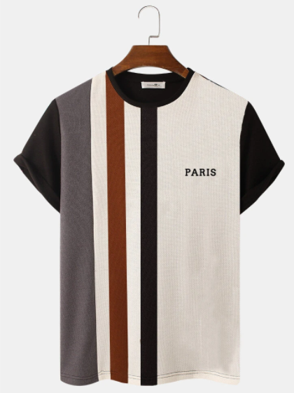 Mens T-Shirt Striped Patchwork Crew Neck Knit Short Sleeve